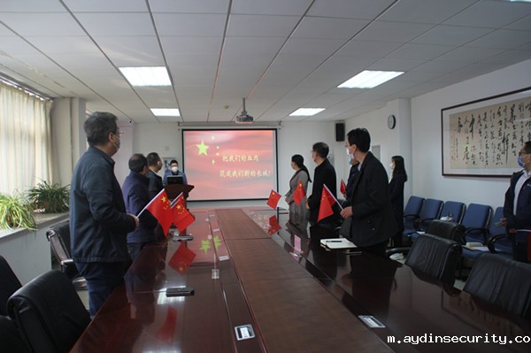 图二现场播放升国旗视频,与会人员全体起立,手举国旗齐声高唱国歌。