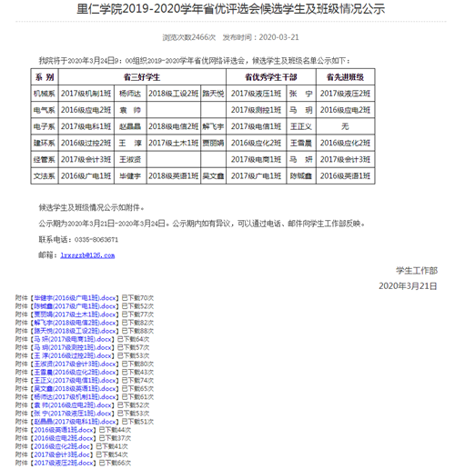 经各系评定小组推荐和公示,学院评审委员会复审后,确定2017级电科1班赵晶晶等10名同学为省三好学生候选人,2017级液压1班张宁等6名同学为省优秀学生干部候选人,2017级液压2班等6个班集体为省优秀班集体候选班级。